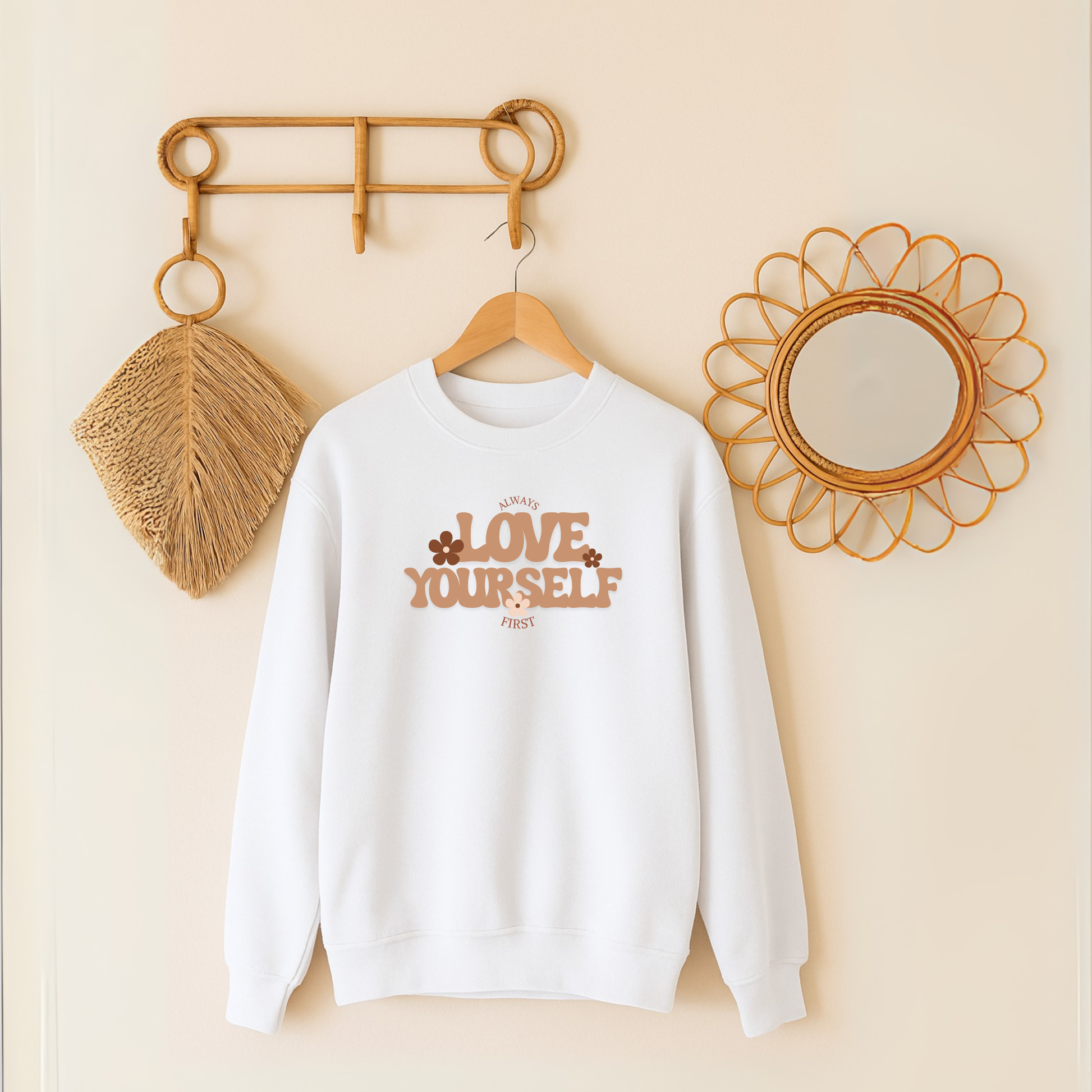 Make self-care your everyday mantra with our “Always Love Yourself First” Sweatshirt. Designed with a timeless retro-inspired font and floral detail, this sweatshirt combines comfort with inspiration. Whether you’re running errands, relaxing at home, or meeting friends, it’s a gentle reminder to put your worth and happiness at the top of your list.